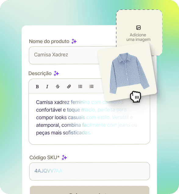 Escolha uma imagem. A loja te ajuda com título, descrição e detalhes do produto. Você revisa o que quiser e publica. Menos tempo no cadastro, mais tempo no que importa.
