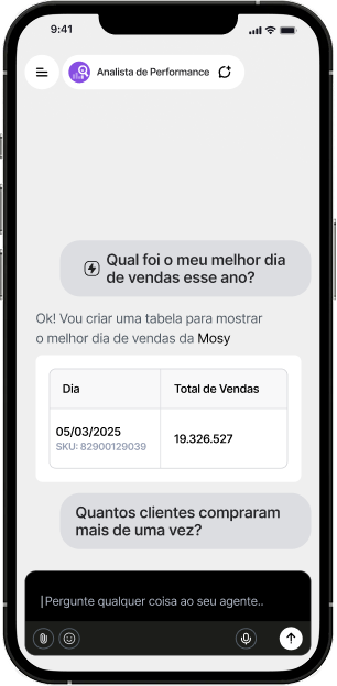 Digite sua pergunta como faria para um amigo. O assistente entende e responde com os dados da sua loja, faturamento, produtos, clientes e conversão.