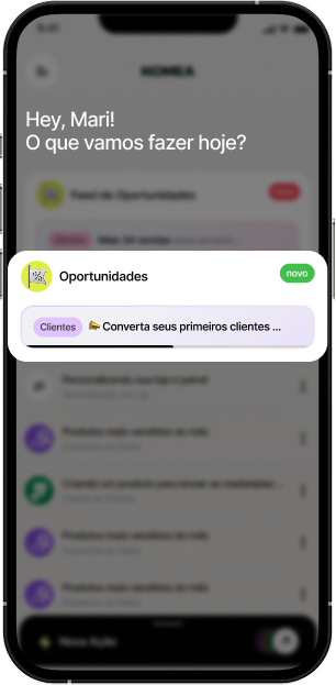 Conheça a Komea, o copiloto de ecommerce que já vem com a sua loja. Ela acompanha o que está acontecendo no seu negócio e te mostra o que fazer a seguir. Sem analisar relatório, sem adivinhar o próximo passo. Você vê as oportunidades e aprova o que faz sentido.